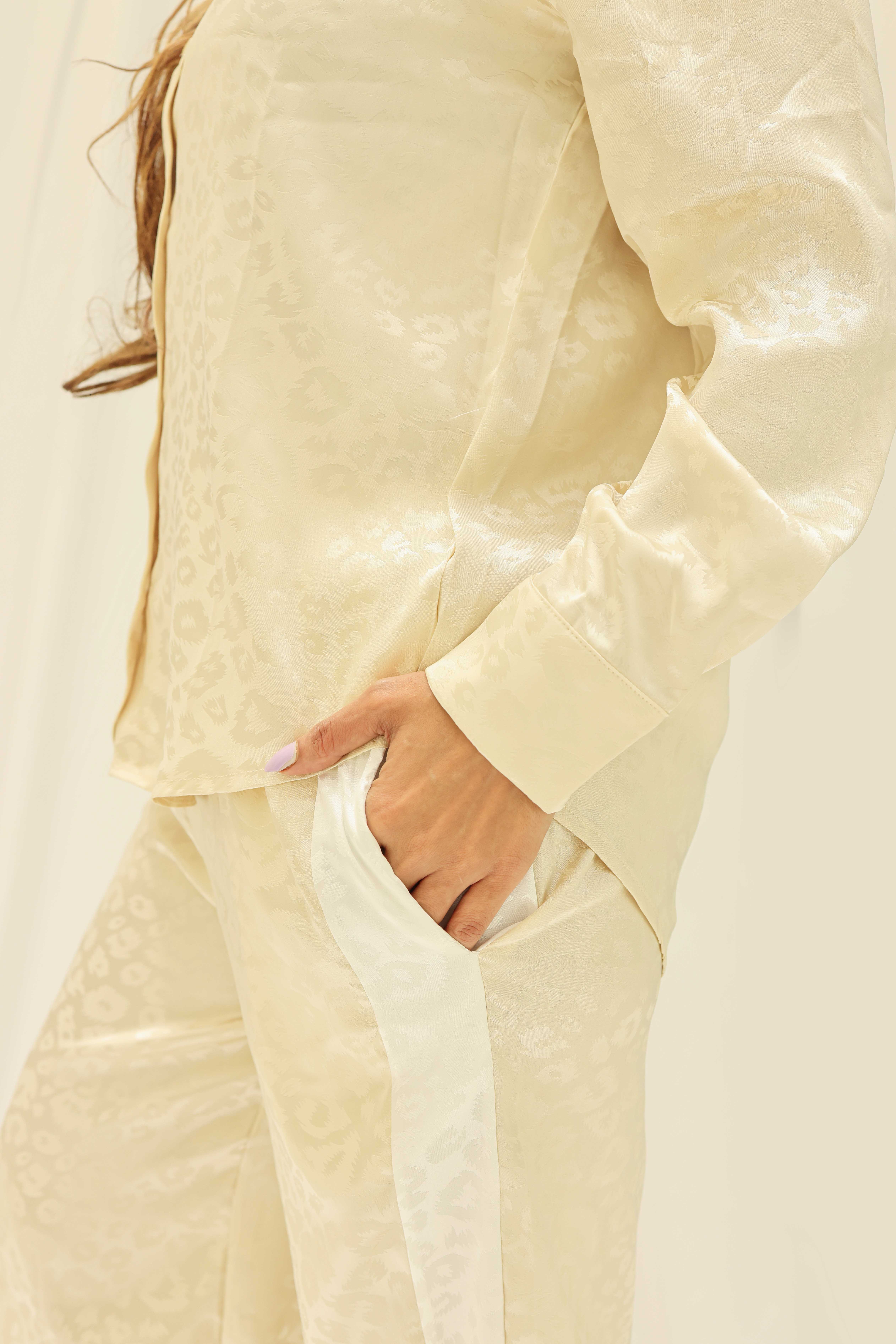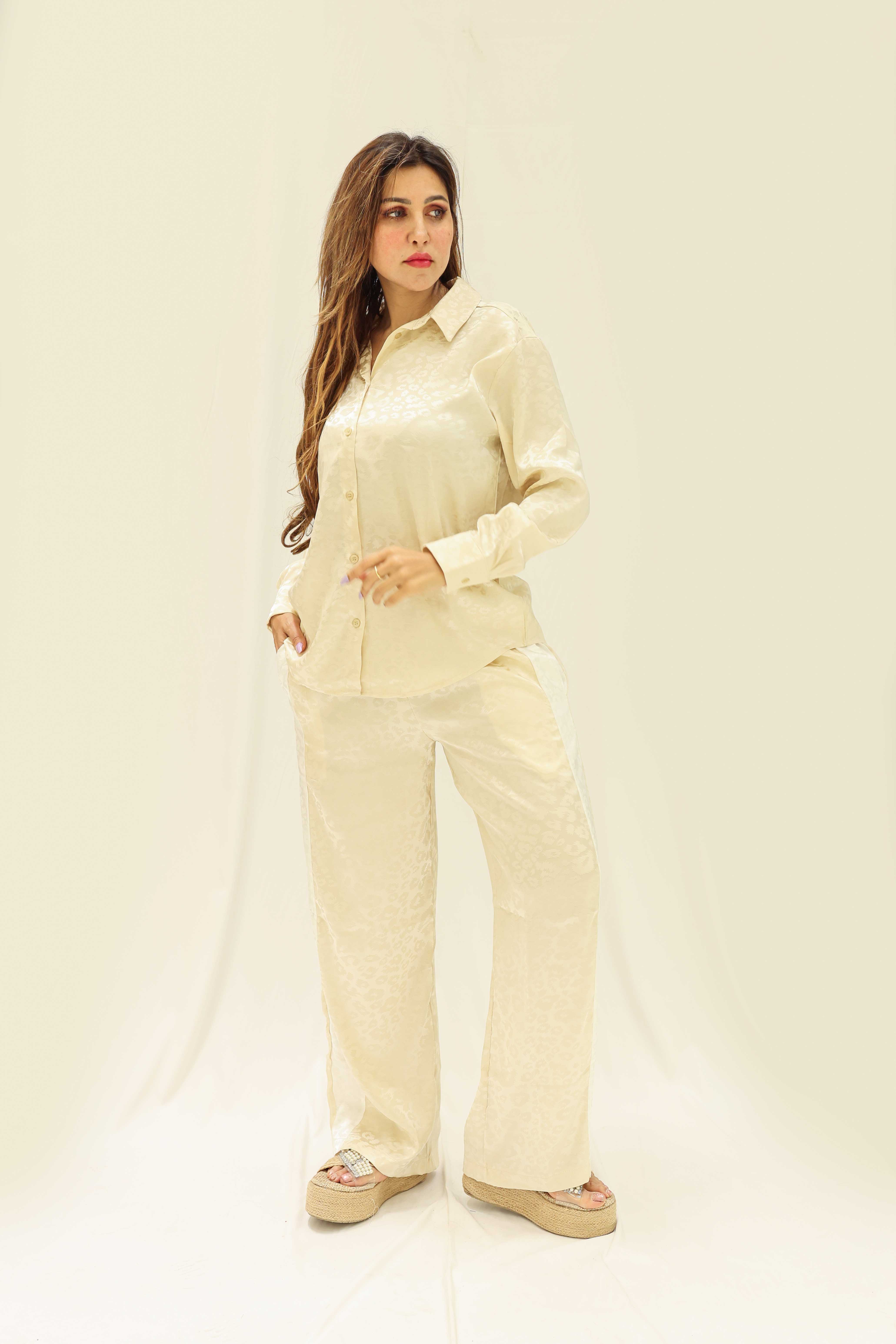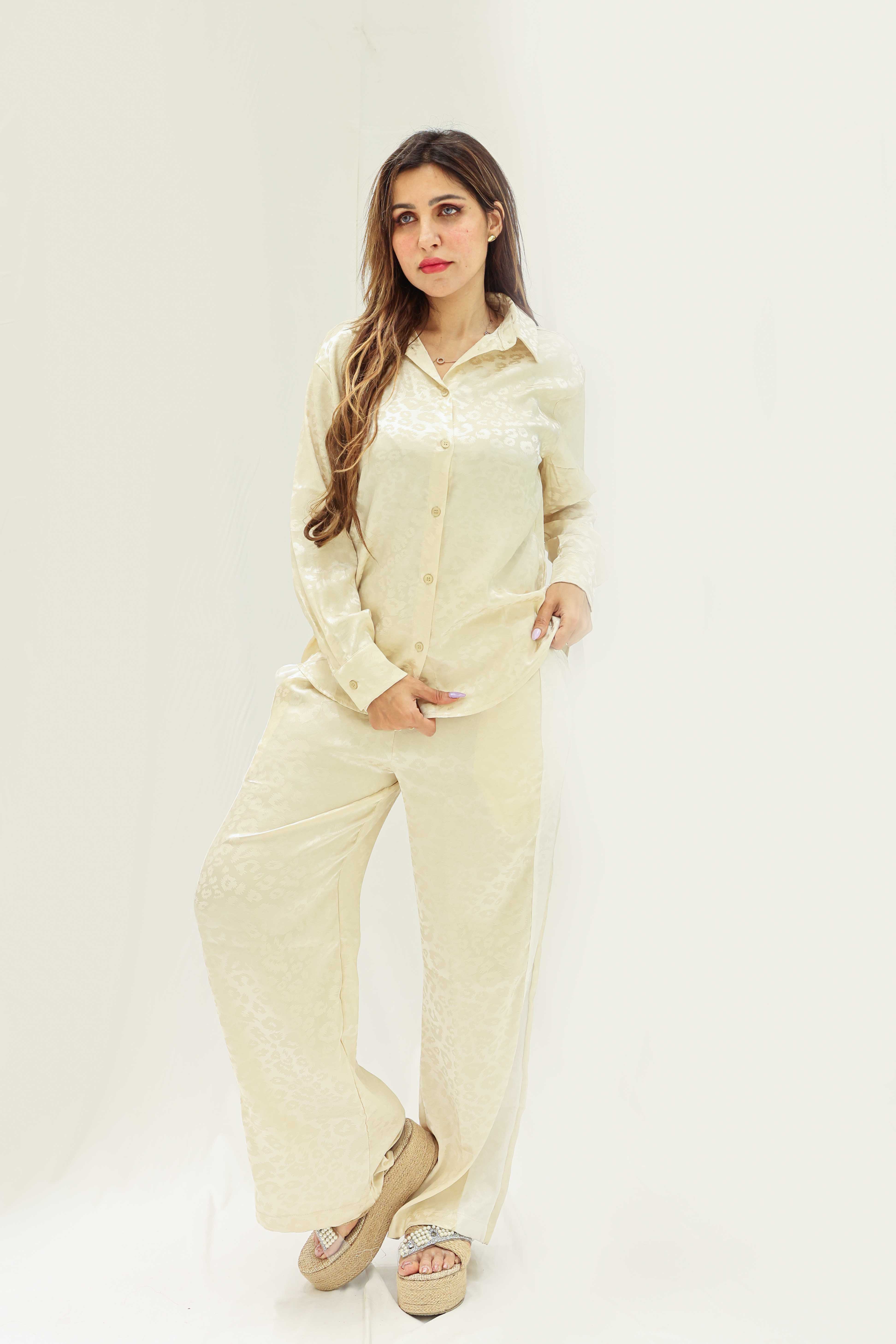 بدلة نسائيه الستان باللون البيج الفاتح أو الكريمي. يتكون الطقم من قطعتين: قميص وبنطلون. القميص بأكمام طويلة وياقة كلاسيكية وأزرار أمامية، ويبدو أن القماش مزخرف بنقوش خفيفة أو جاكار تضيف إليه لمسة أنيقة. البنطلون واسع الساقين