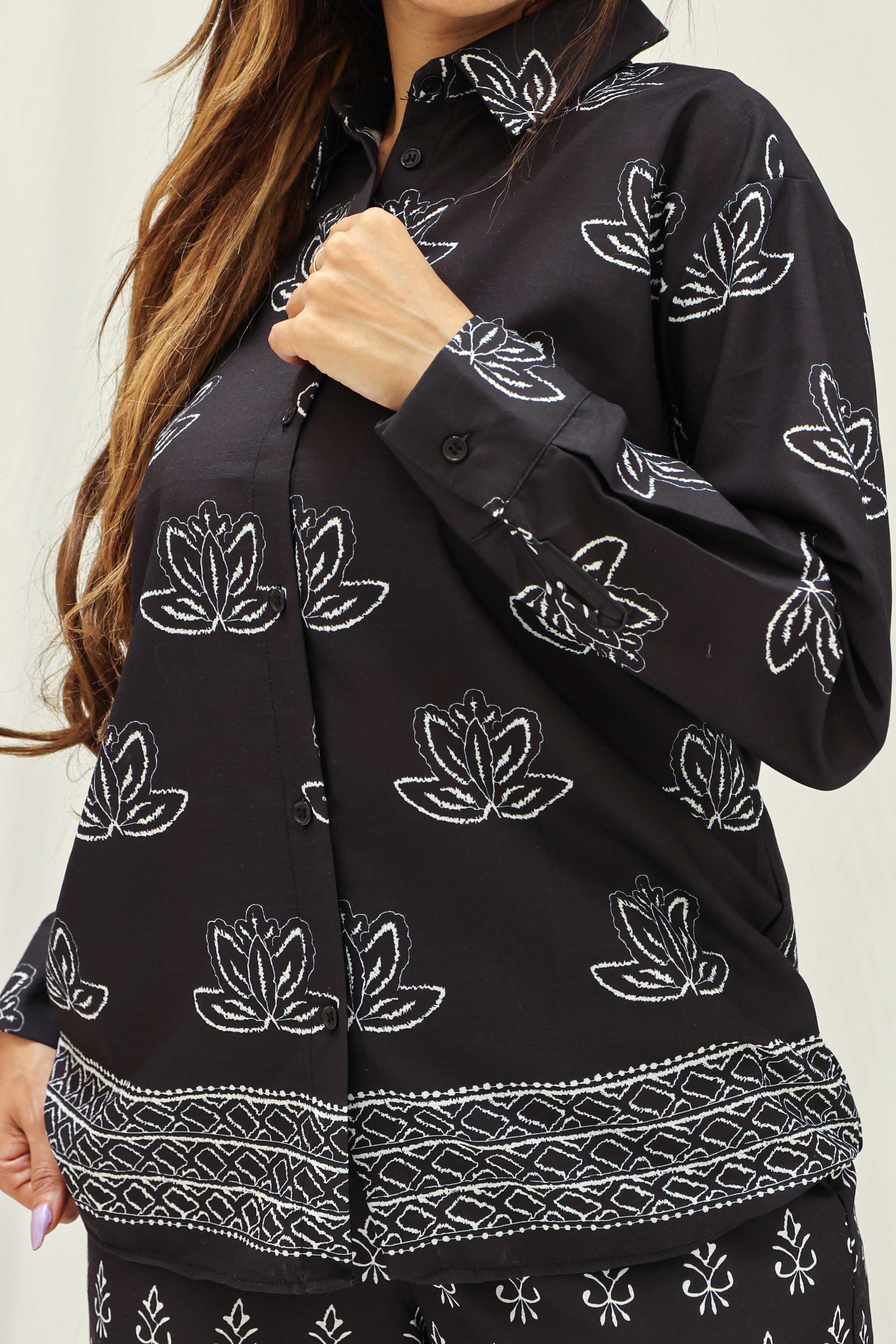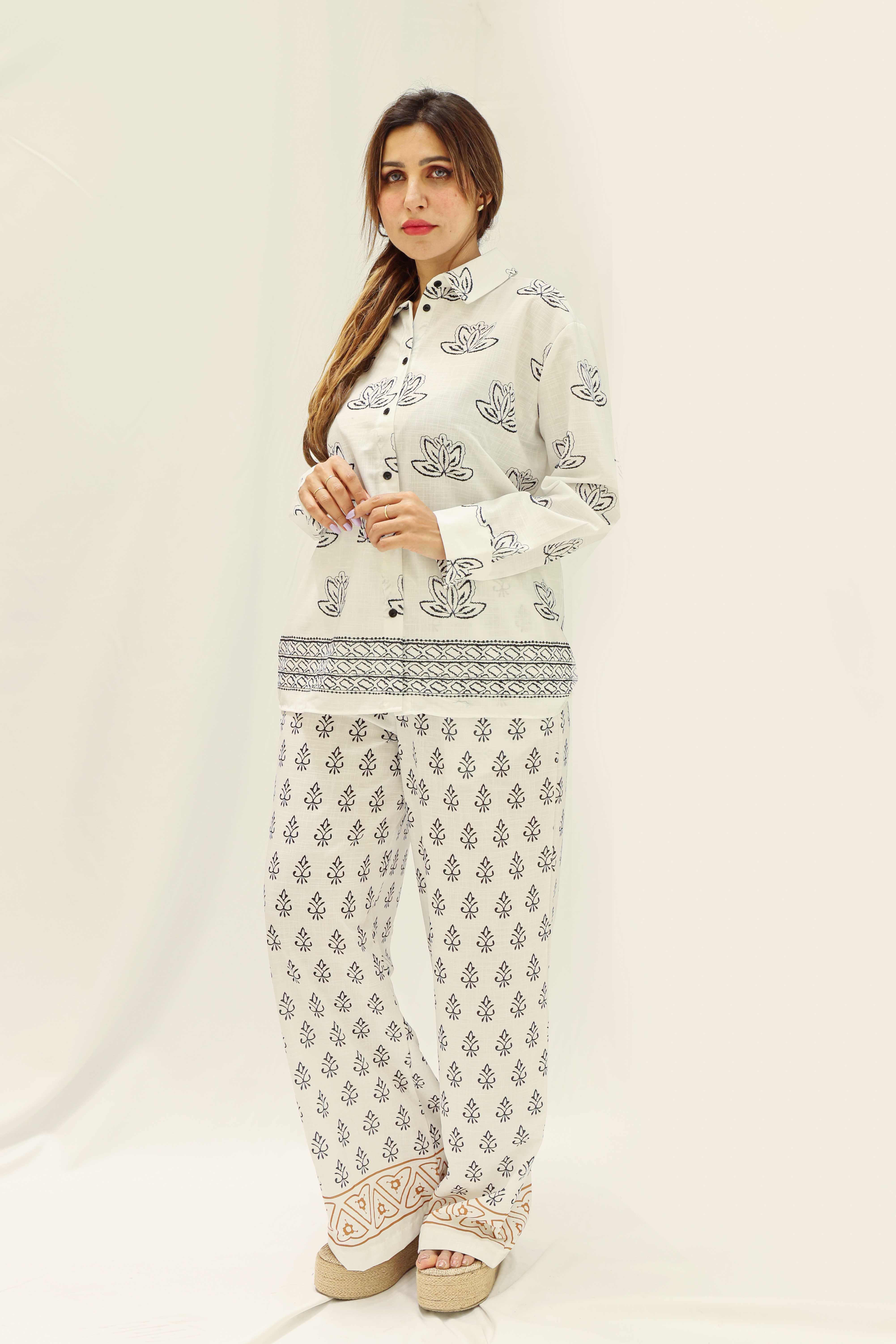 هذا المنتج عبارة عن طقم من قطعتين باللون الأسود، مزين بنقوش بيضاء مميزة. يتكون الطقم من قميص بأكمام طويلة وياقة، يتميز بنقشة كبيرة لزهور اللوتس البيضاء على خلفية سوداء، مع شريط زخرفي بنمط أبيض وأسود على الحافة السفلية للقميص. الجزء السفلي هو بنطال واسع مريح، يحمل نفس النقشة البيضاء الصغيرة المتكررة التي تشبه الأوراق أو الرموز، مع شريط عريض بنقشة هندسية باللونين البرتقالي والبني على حافة البنطال السفلية. يبدو الطقم مصنوعًا من قماش خفيف ومريح، ومناسب للمنزل أو للارتداء الكاجوال.