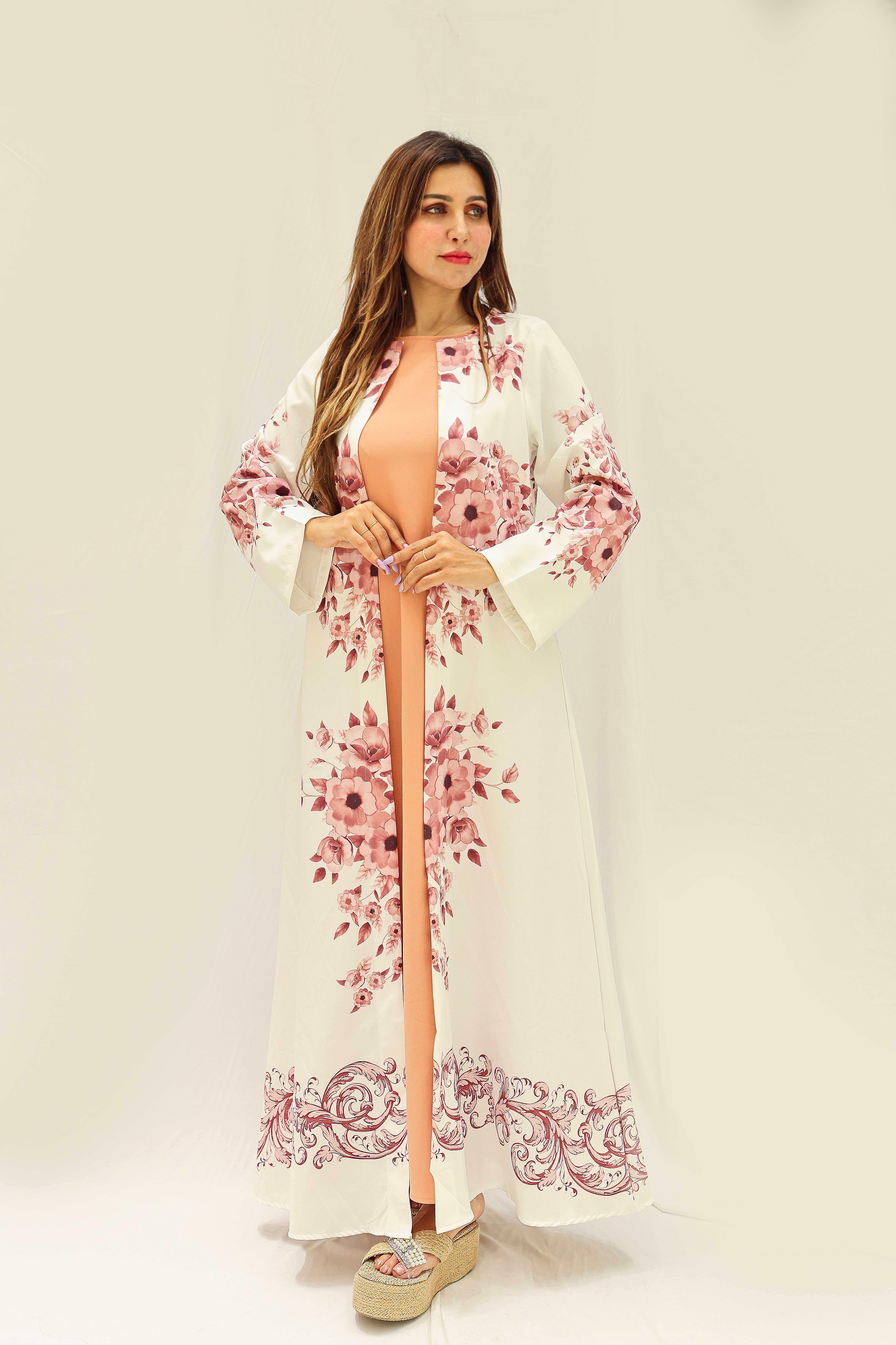 A stunning two-piece set consisting of an inner dress topped with an elegant open kaftan. The kaftan is made of light-colored fabric, possibly white or off-white, adorned with large, beautiful floral patterns scattered across the front and along the edges with intricate embellishments. The set is cinched at the waist with a coordinating belt. This "double-face" dress (often referring to a layered look) exudes a refined and sophisticated appearance.
