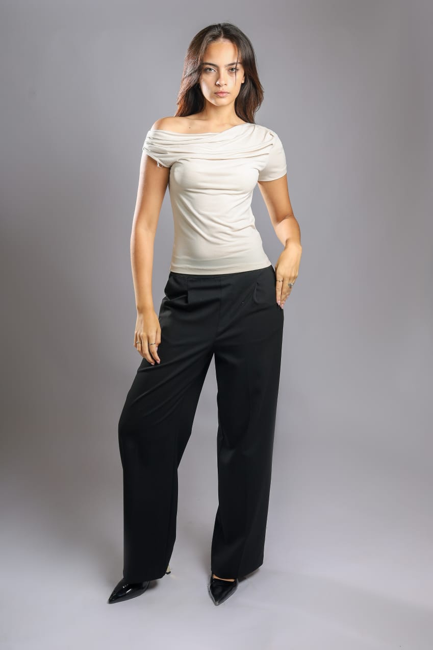 Basic top in cashmere color, light and comfortable, with a unique design that stands out.