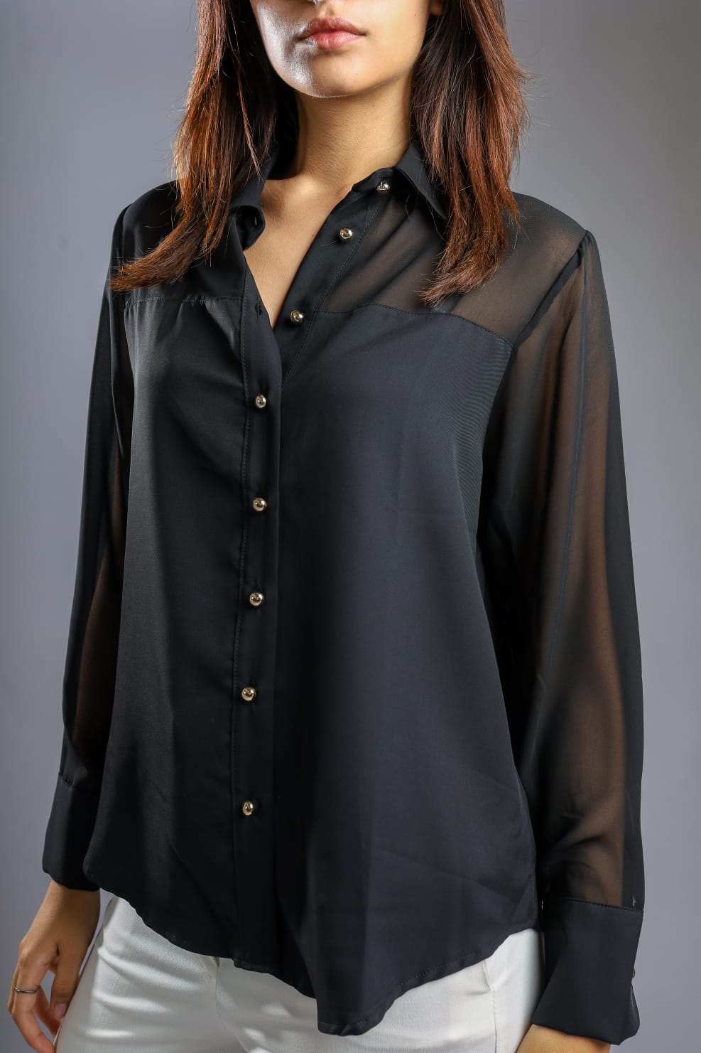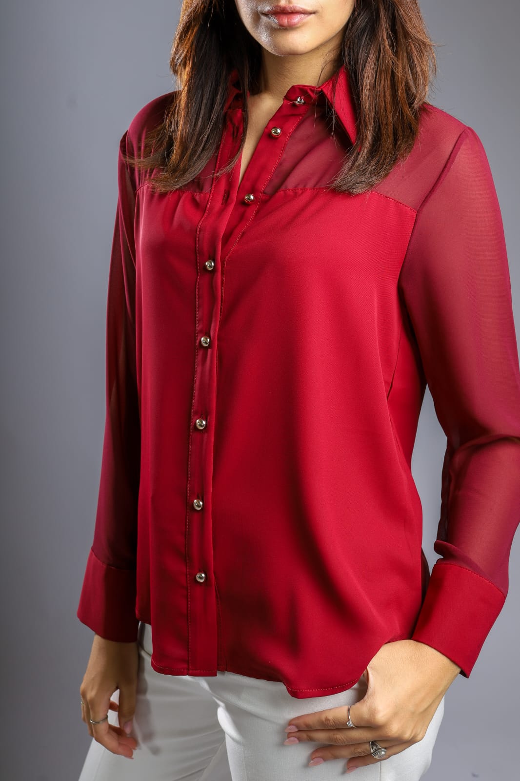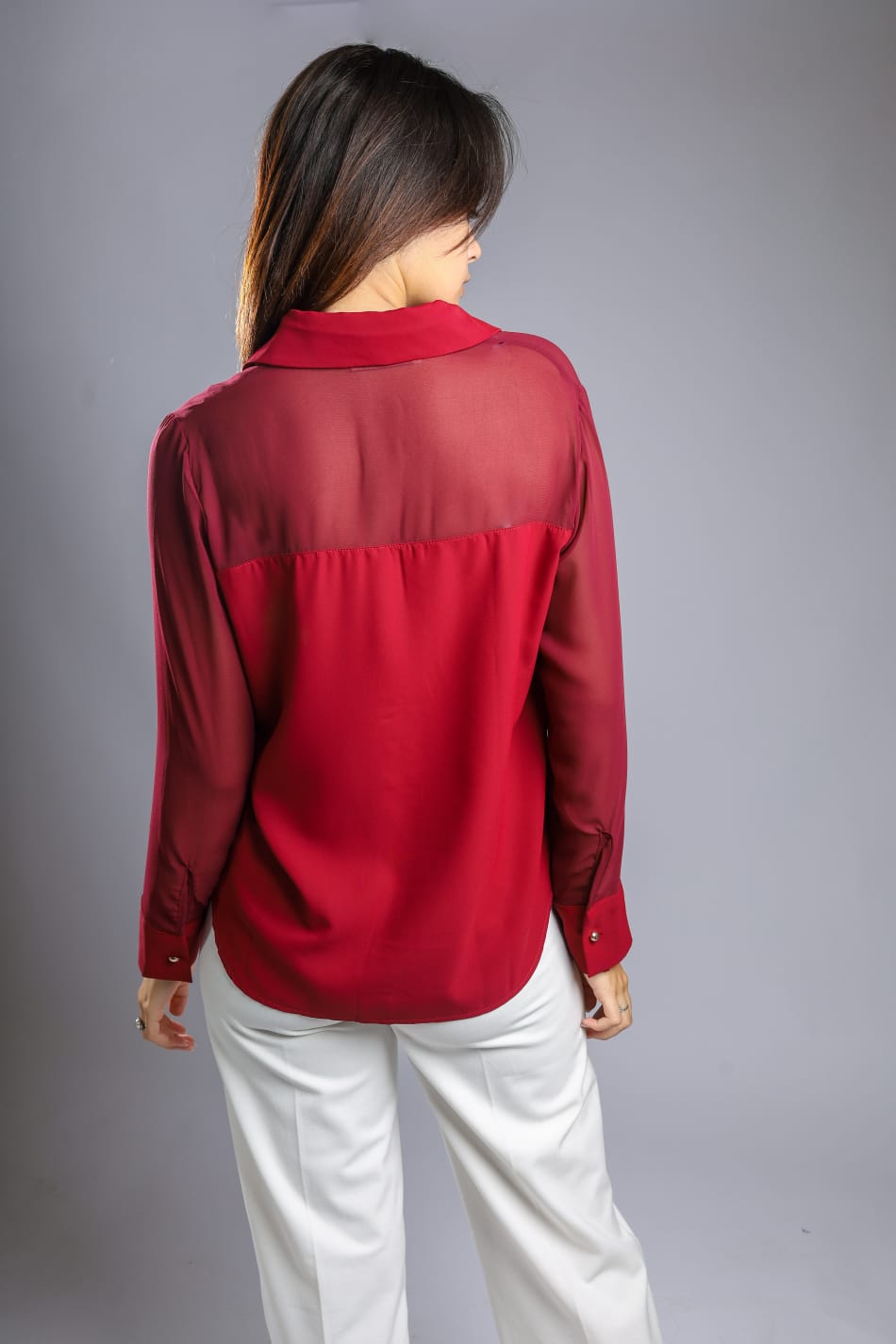 Elegant chiffon blouse with long sleeves and front buttons, available in black, white, and burgundy. Simple and classy design suitable for both classic and casual looks, with a lightweight comfortable fabric perfect for all seasons